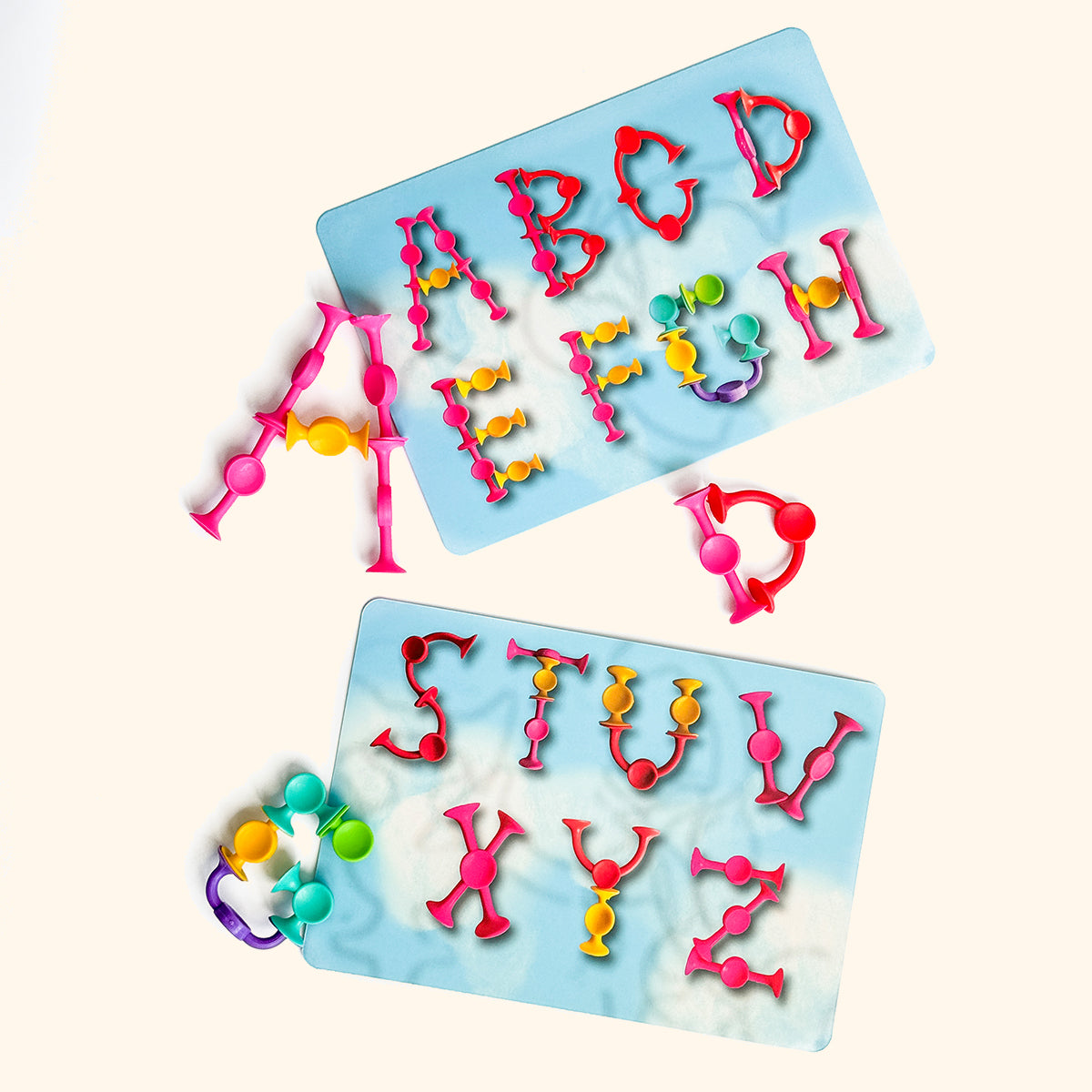 • helfen beim Erkennen von Zahlen sowie dem Alphabet, das nach Vorlage aus Saugnäpfen zusammengesetzt werden kann,