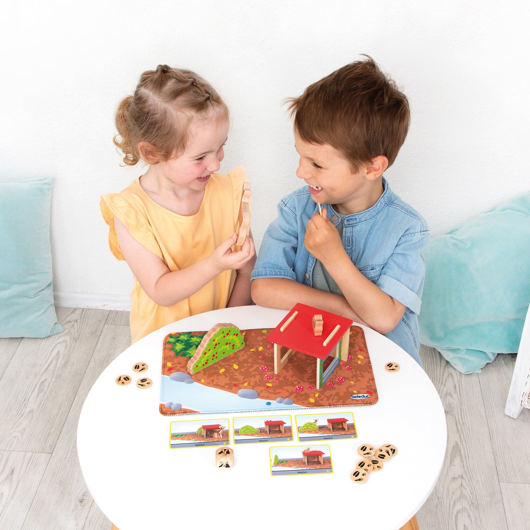 Tipp: Die Spielkarten eignen sich gut zum Üben von Raum-Beschreibungen. Gehe vor dem Spiel gemeinsam mit den Kindern die Karten durch und lasse sie beschreiben, was sie darauf sehen!