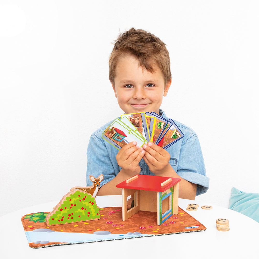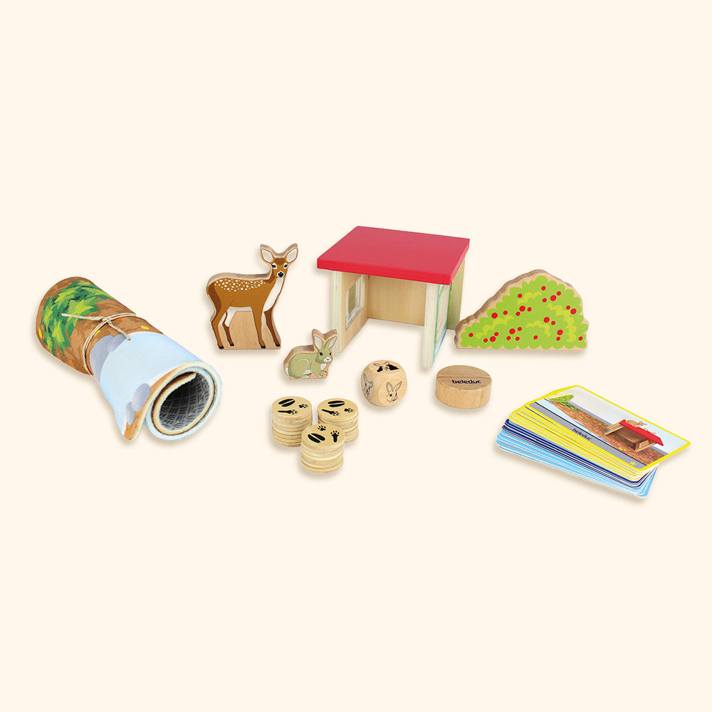 • 3 Spielfiguren: Hase, Reh, Busch