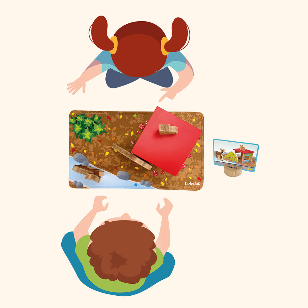 Beschreibe das Versteck von Reh Reni und Hase Hops und baue es mithilfe einer Hütte und eines Busches nach. Das fördert nicht nur das räumliche Vorstellungsvermögen, sondern unterstützt auch die sprachliche Entwicklung.